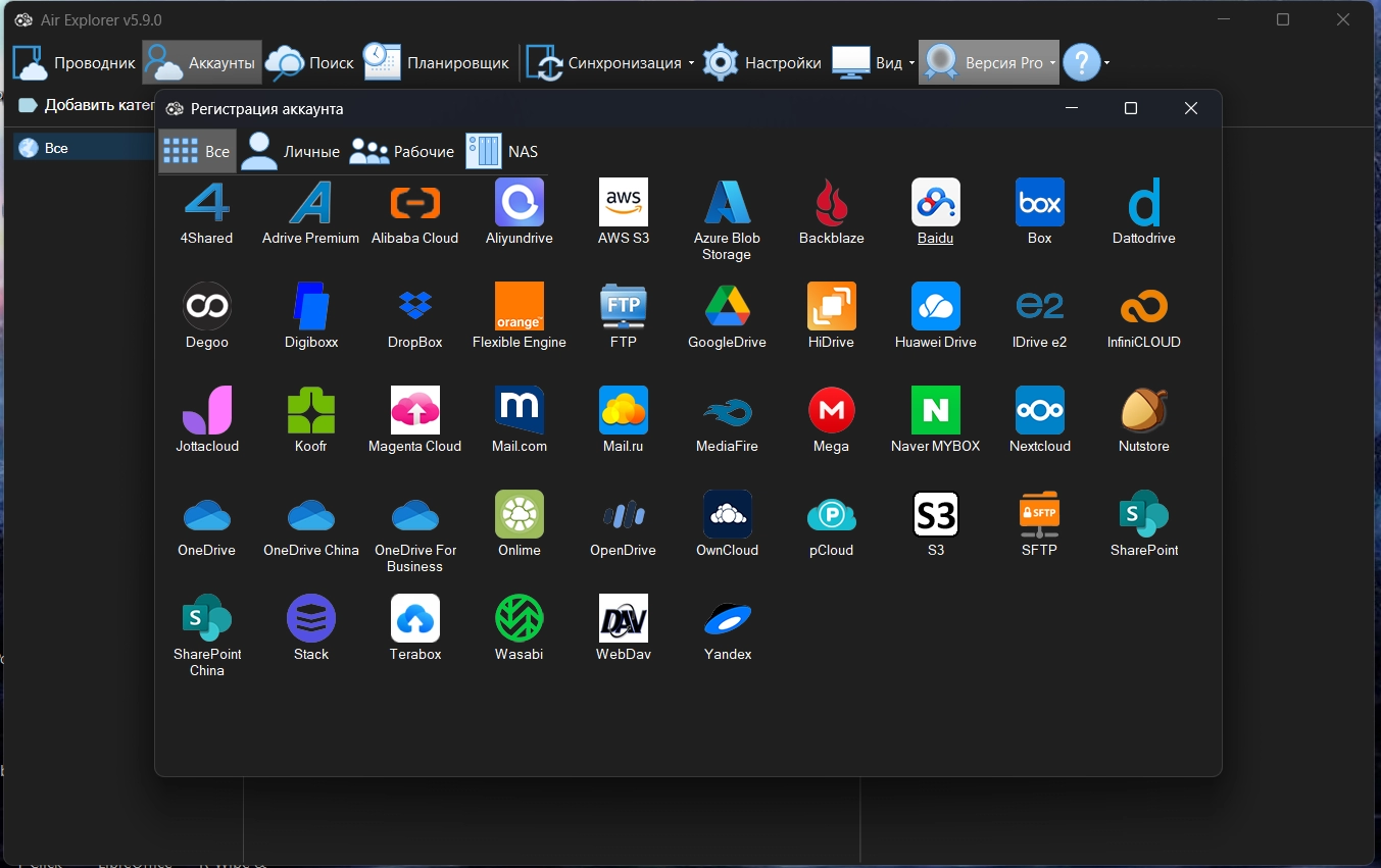 Air Explorer Pro — один из лучших файловых менеджеров для работы с облачными хранилищами. Программа поддерживает работу с такими сервисами: OneDrive, Google Drive, 4shared, Box, Dropbox, Mega, Copy, Mediafire, Yandex, Baidu, Mail.ru, поддержка подключения по протоколам WebDAV, FТP и SFTP.