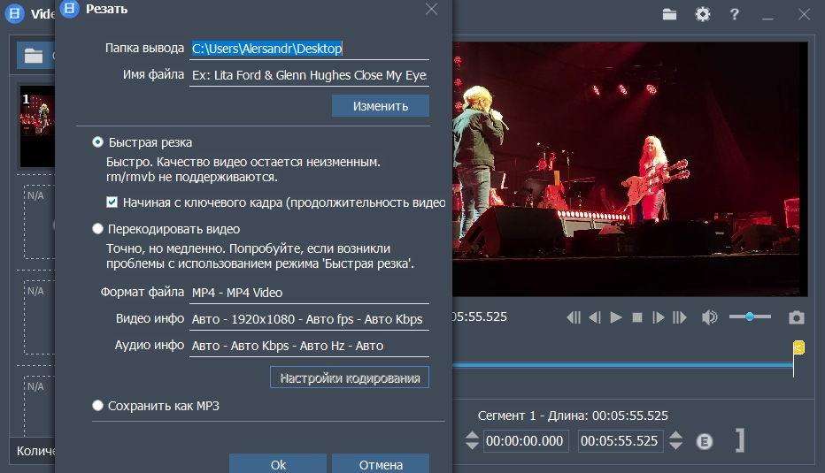 • Вырезанные части можно конвертировать в другие видеоформаты.