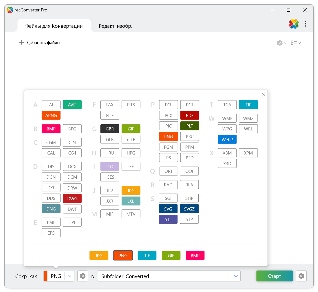 • Преобразовывает графические файлы в любые типы форматов.