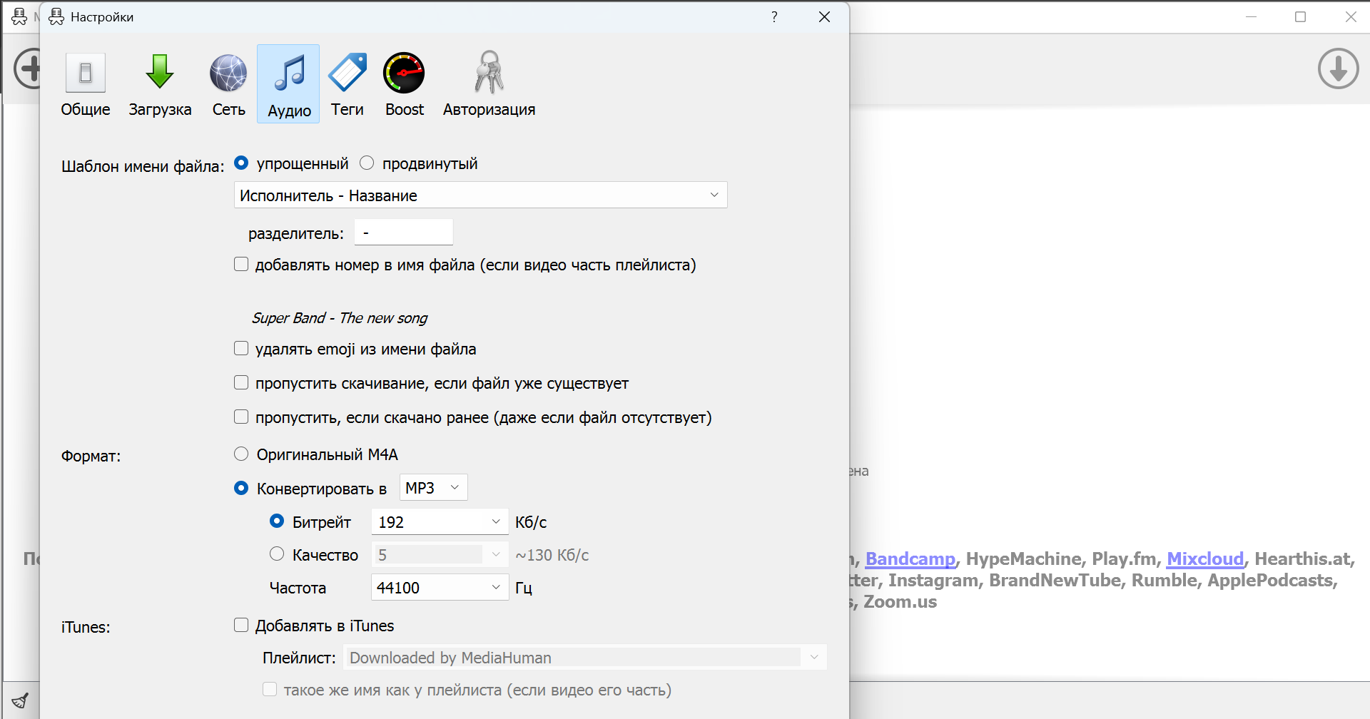 В настройках приложения можно выбрать опцию автоматического добавления скачанных песен в библиотеку iTunes. Можно также указать плейлист, куда следует добавить преобразованный трек.