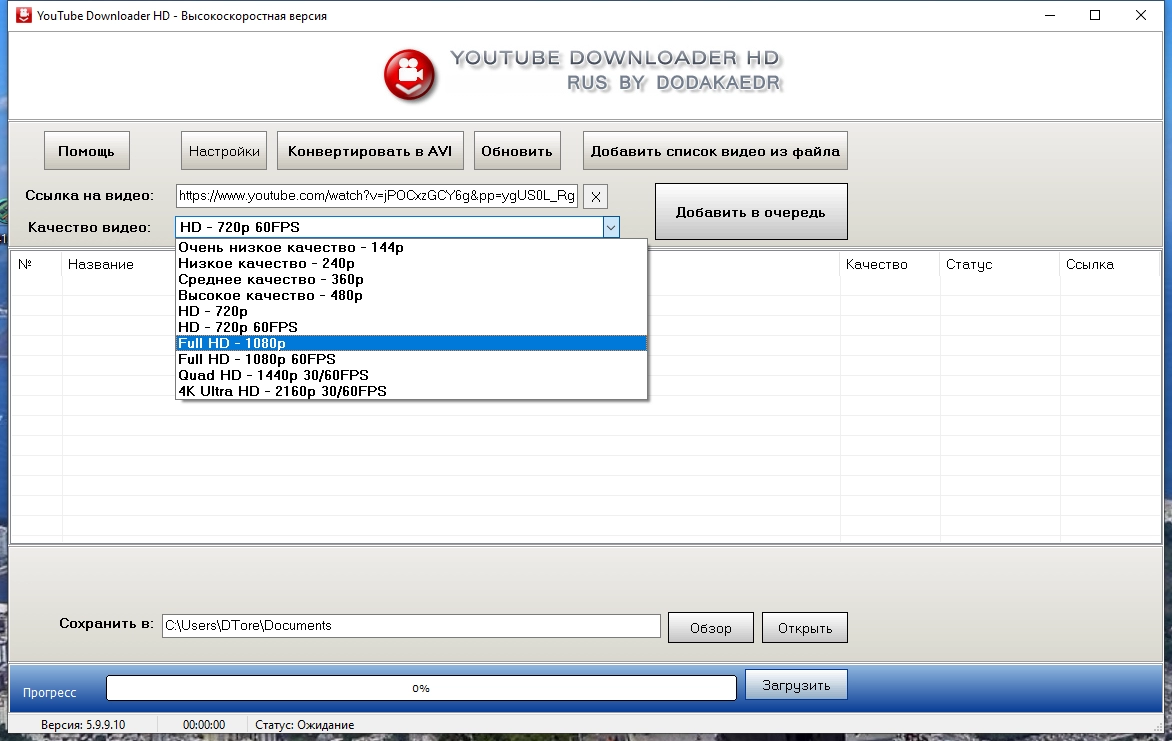 Youtube Downloader HD - бесплатная и предельно простая в использовании программа для скачивания видео с YouTube и сохранения его на компьютере с возможностью конвертирования в формат AVI или MP4 (совместим с IPod, iPhone). Достаточно вставить ссылку на нужный файл в окошко программы и указать папку для сохранения видео, после чего вы получите интересующий вас AVI или MPEG файл. Главная отличительная особенность Youtube Downloader HD состоит в том, что теперь вы можете загружать c YouTube видеоролики высокого качества и высокой четкости (Full HD, 4K Ultra HD, Quad HD).