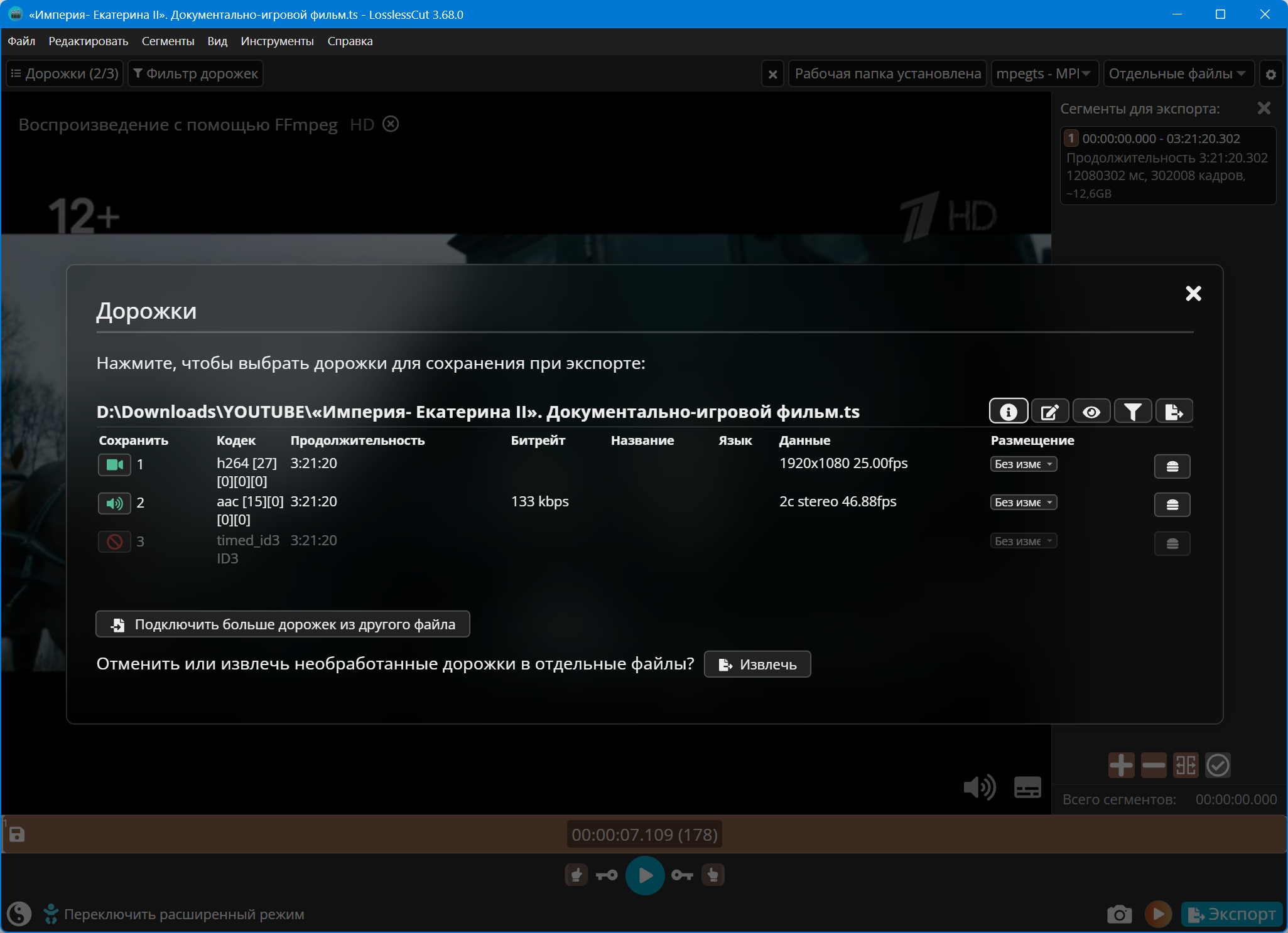 • Файл может содержать более 2-х звуковых потоков или вовсе без звуковой дорожки, можно удалять (опционально).