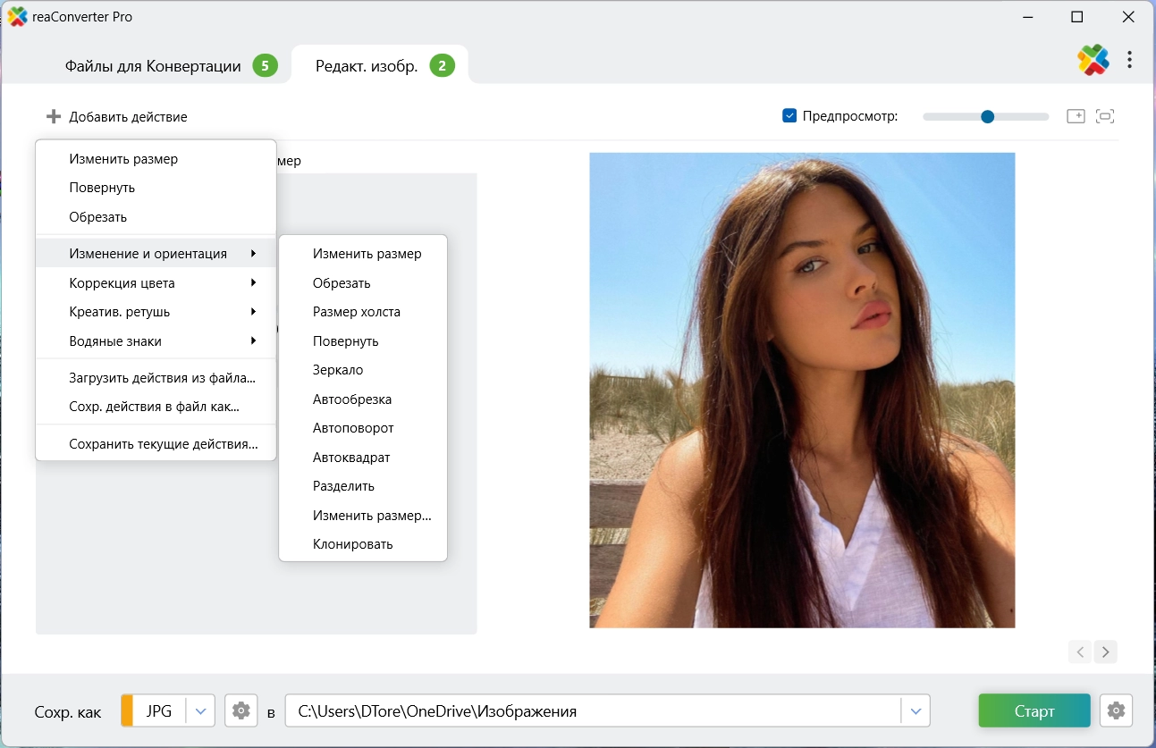 • Изменение ориентации: Изменить размер, Обрезать, Размер канвы, Повернуть, Зеркально отразить, Автоматическое кадрирование, Автоматический поворот, Сделать квадратным.