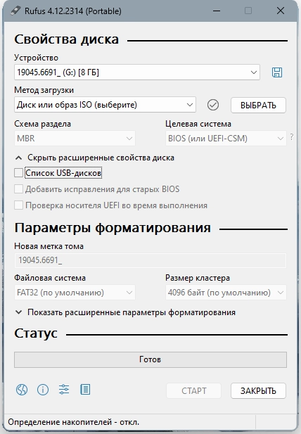 ✅ Пользователь может при желании выровнять разделы на флэшке (пункт Add Fixes for Old BIOSes, который скрывается в разворачивающемся меню Format Options). Если машинка у вас совсем старая и не определяет загрузочный USB-накопитель, попробуйте активировать эту опцию – может помочь.
