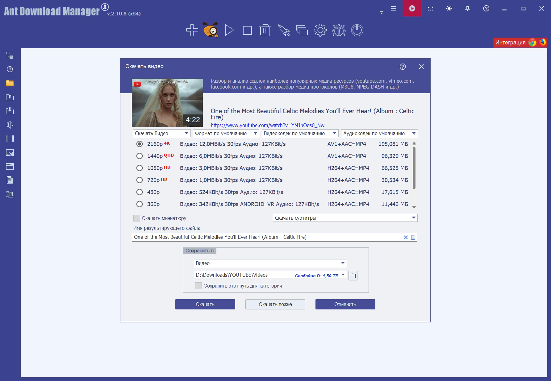 Некоторые наиболее развитые и популярные видео сервисы (например, youtube.com, vimeo.com, dailymotion.com и др.) или медиа протоколы (например, F4M, M3U8, MPEG-DASH и др) предлагают выбор формата, качества и разрешения для загрузки видеофайла. AntDM умеет распознавать такие форматы и предлагает на выбор к загрузке.