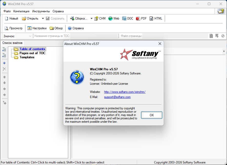 WinCHM - небольшая утилита для создания файлов помощи, книг или журналов в формате HTML, CHM, Web help, PDF и Word файлов. Для работы в программе не обязательно обладать знаниями HTML, можно писать и редактировать текст так же как вы делаете это в Word, редактируя уже готовые документы CHM или создавая свои. Имеется визуальный дизайнер CHM и возможность редактировать внешний вид документа используя свои шаблоны, которые можно сохранять для последующего применения, так же присутствует визуальный редактор оглавлений.