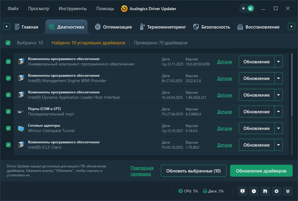 Auslogics Driver Updater – программа представляющая собой очень простой, удобный и в тоже время эффективный инструмент для обновления драйверов операционной системы Windows. Она просканирует ваш компьютер и после сканирования Вашего компьютера на присутствие драйверов ко всем устройствам, она составит список устройств которые требуют установки драйверов и предложит их установить.