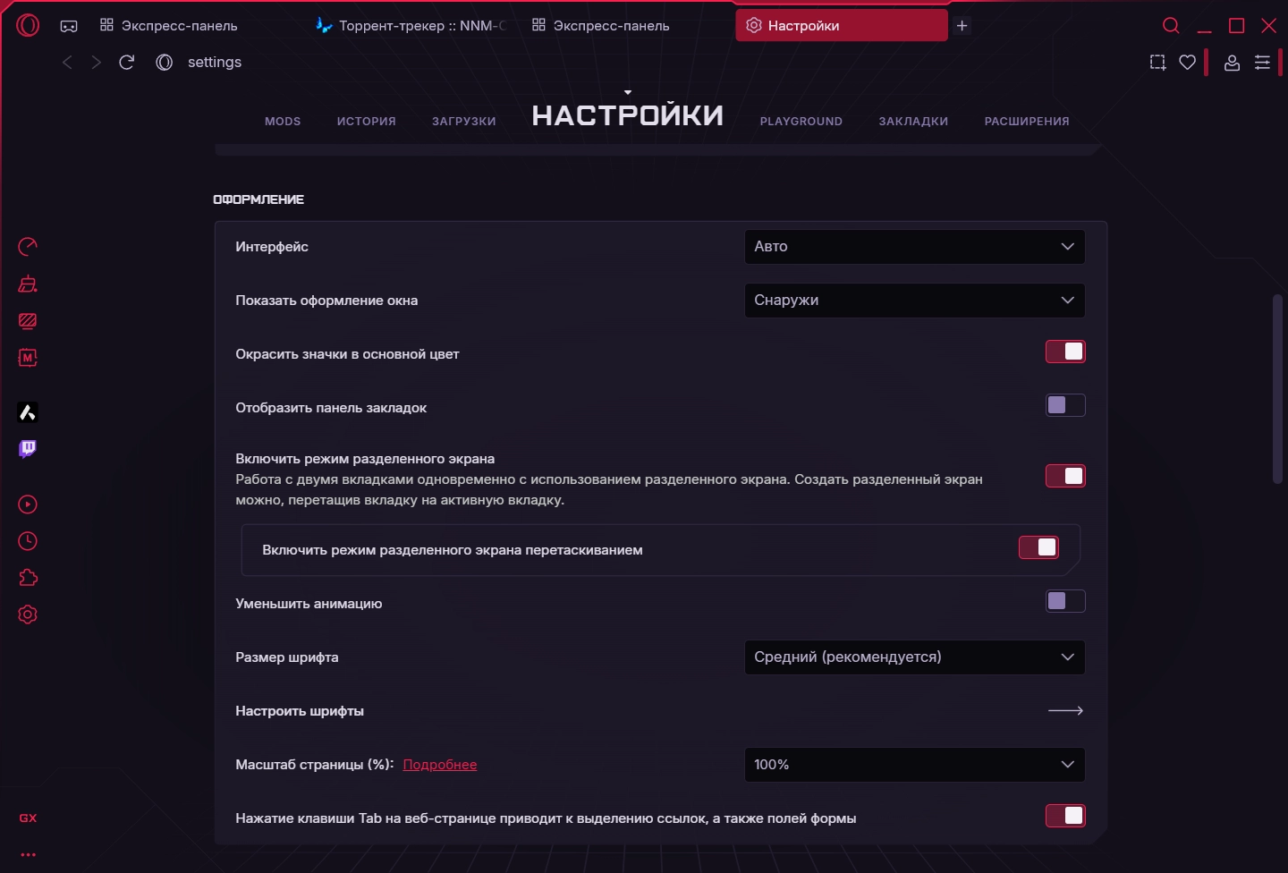 • Opera GX имеет встроенные в браузер звуковые эффекты. Звуковые эффекты можно включать и выключать в настройках.