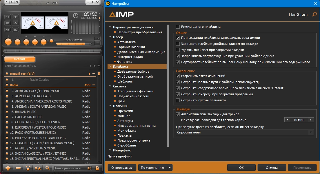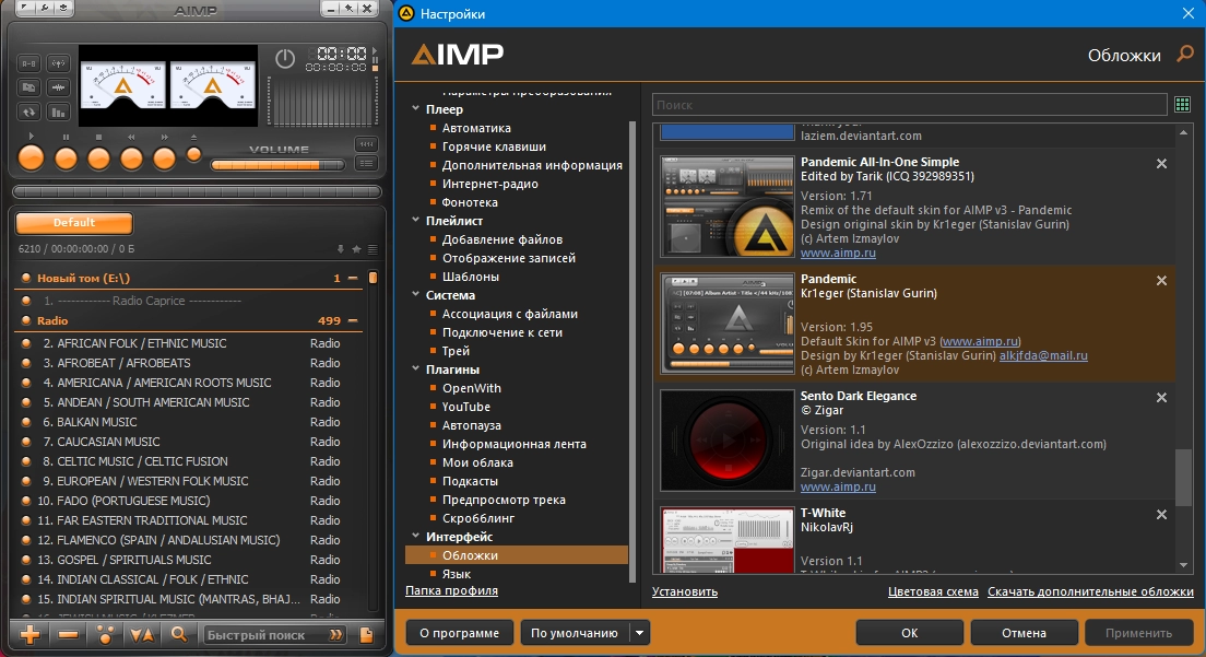 скинов, кодировщиков, плейлист радиостанций: Radio Caprice, 101.RU, Зайцев.FM, DI FM, 1.FM,