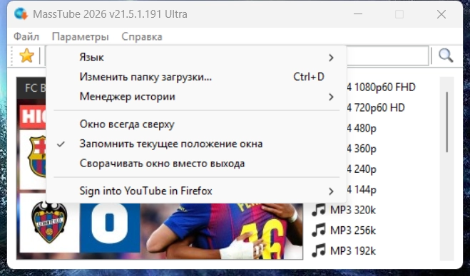 Особенностью MassTube Plus является то, что благодаря этой программе возможно скачивать видео с YouTube не вводя логин и обходя ограничения возраста для видео. Все ссылки, по которым были воспроизведены скачивания сохраняются в историю (избранное), где Вы потом сможете ими воспользоваться или удалить.