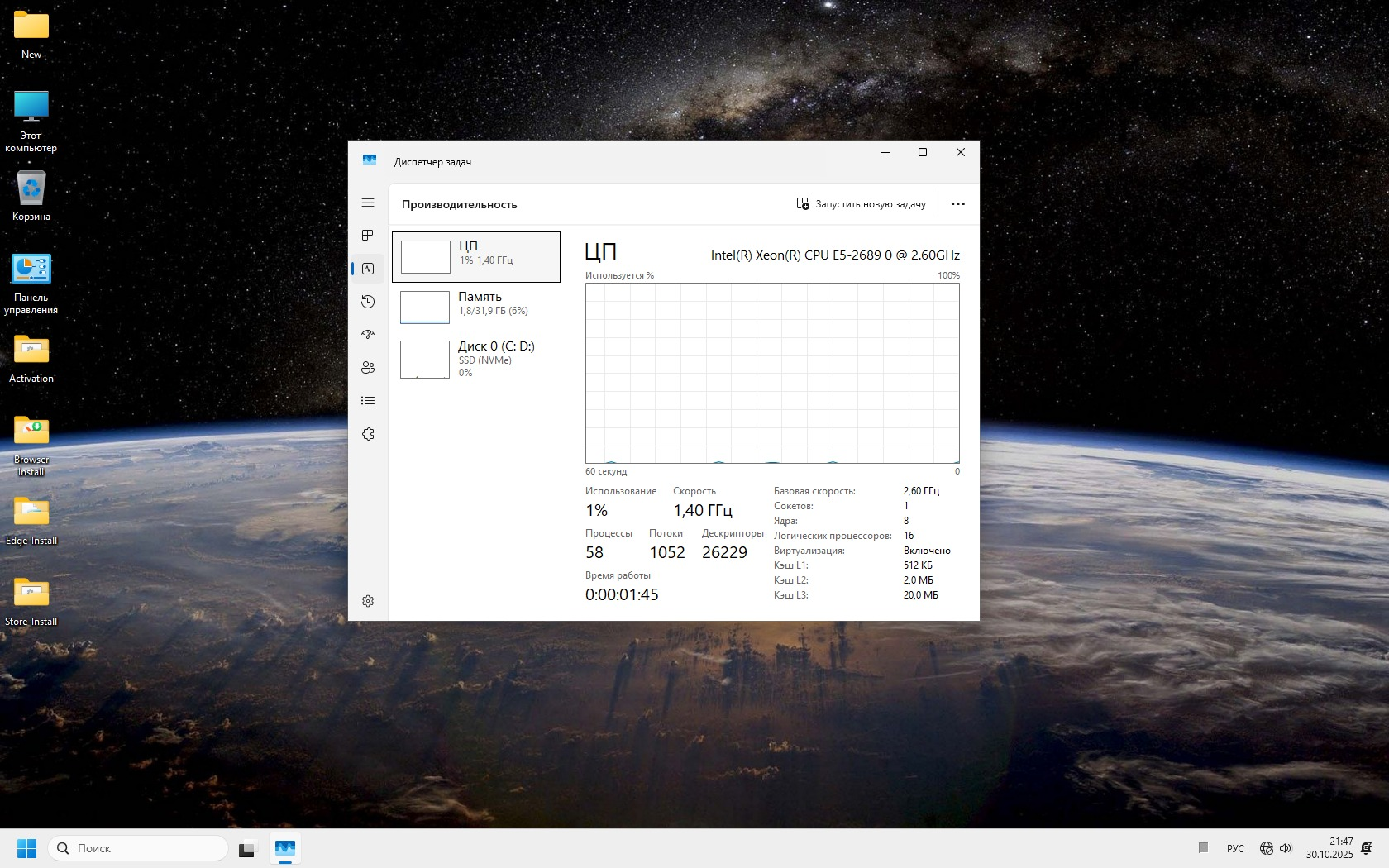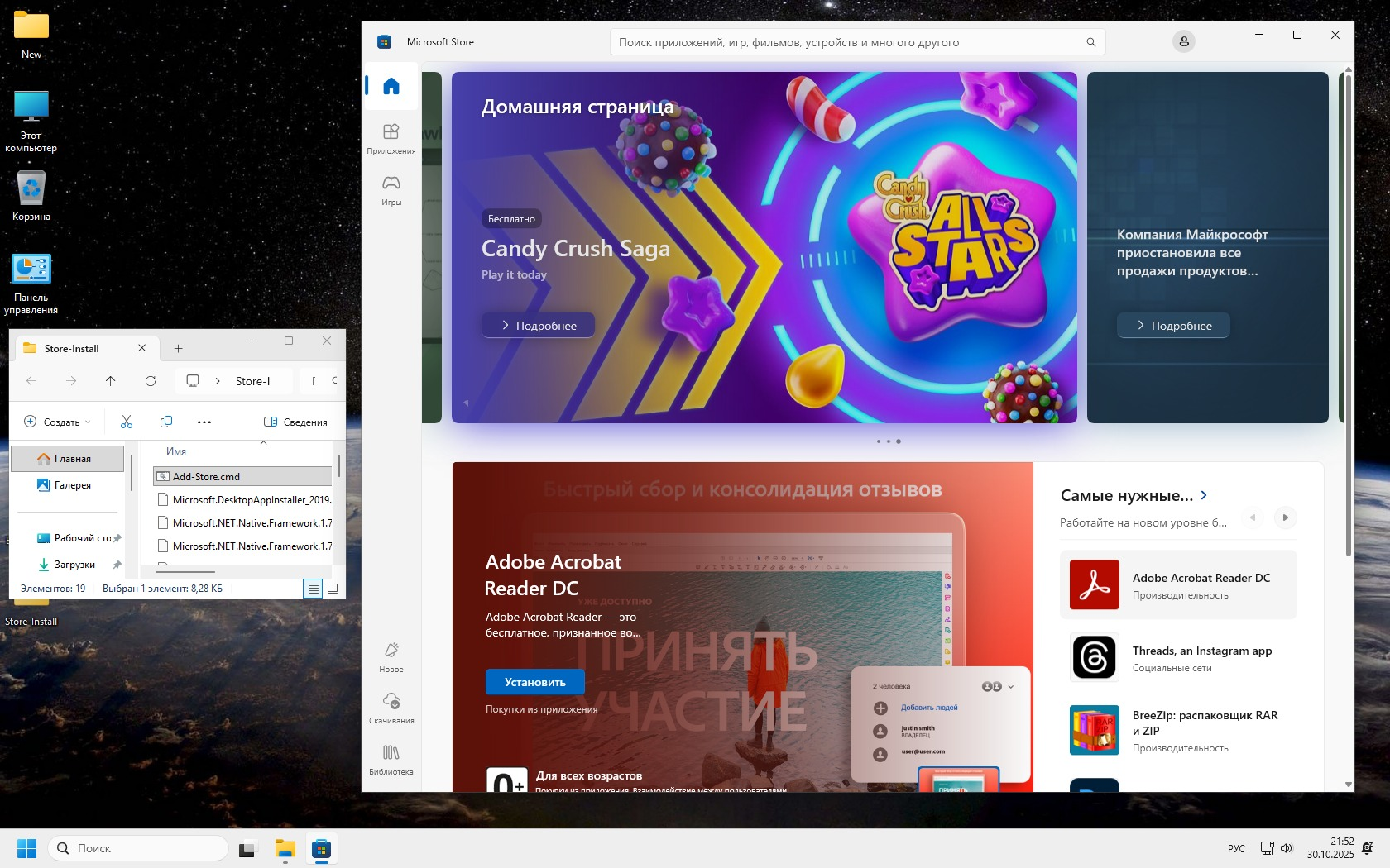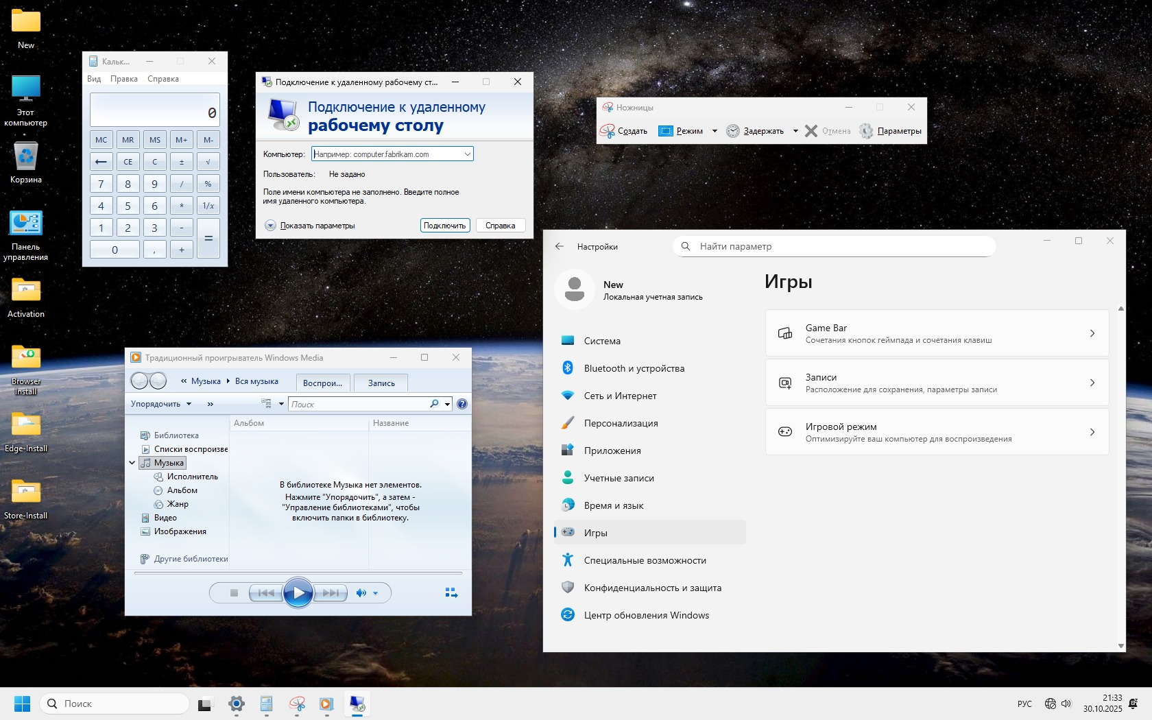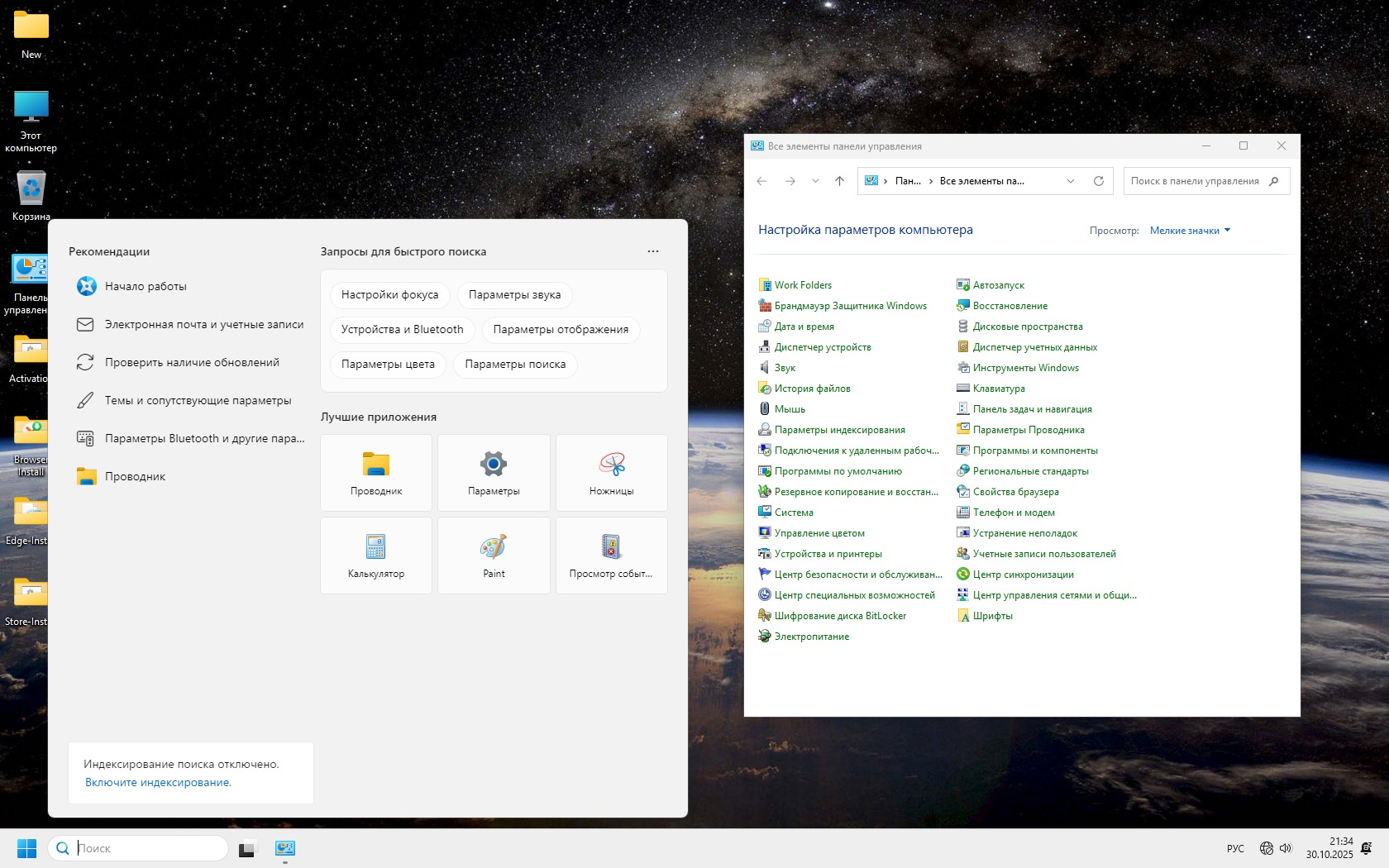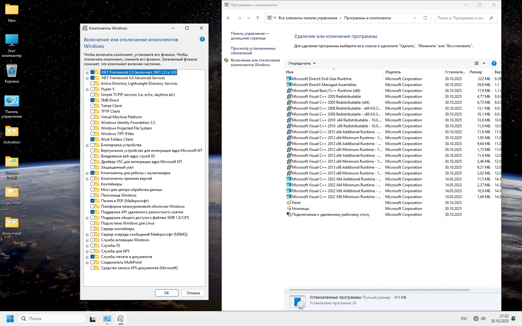 • Центр Безопасности, Defender и UAC отключены, но при желании Edge и Microsoft Store можно вернуть через установщики на рабочем столе.