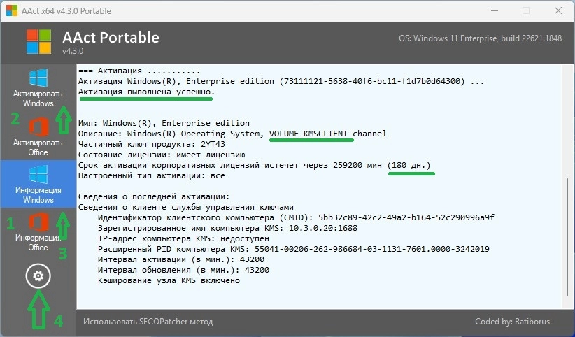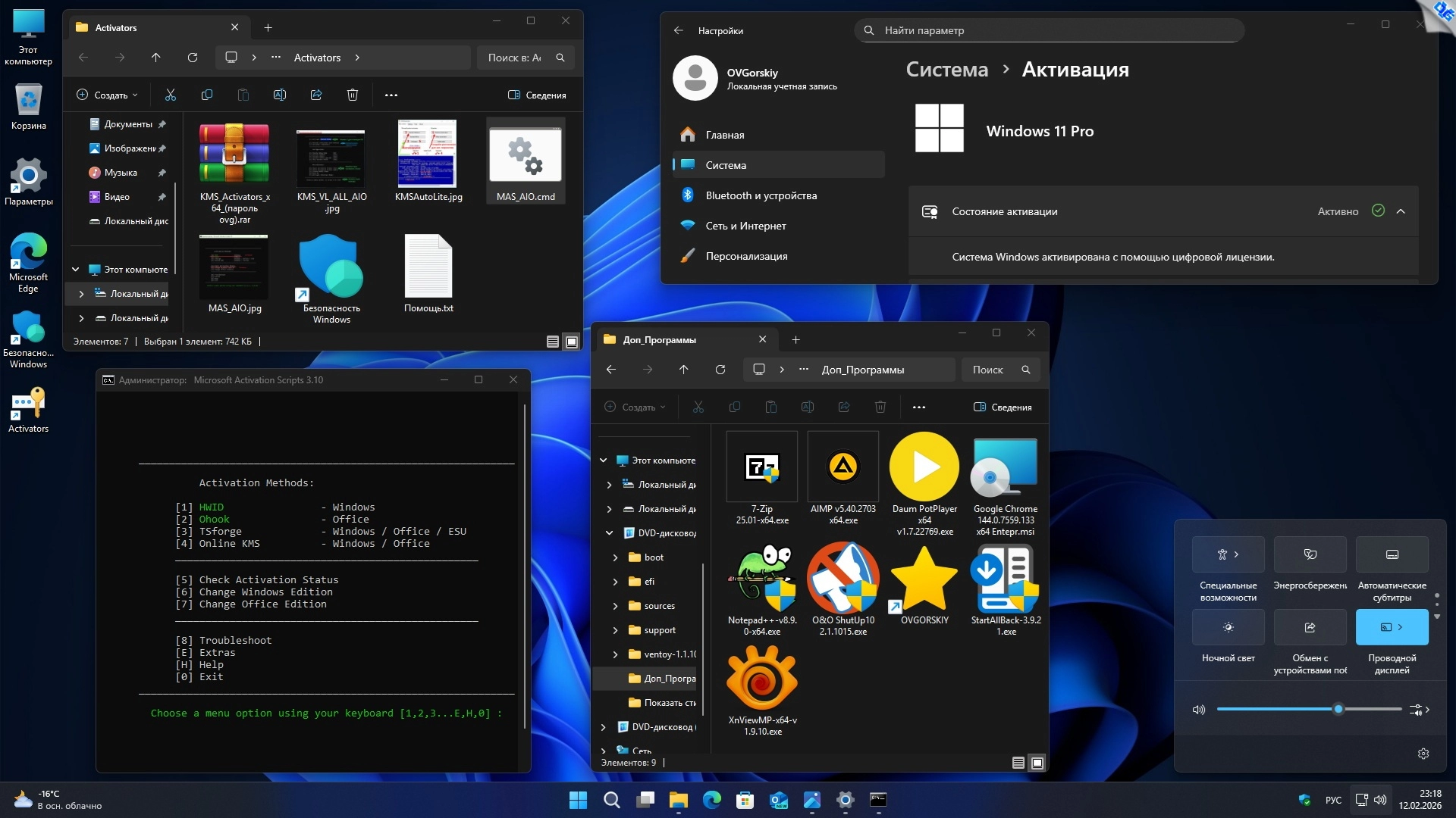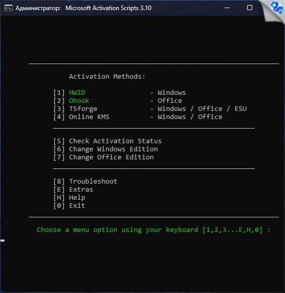 • Можно воспользоваться простым и надёжным активатором Microsoft Activation Scripts (MAS_AIO) (запускать от Администратора)